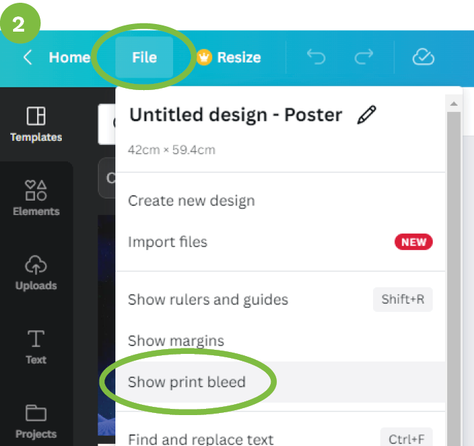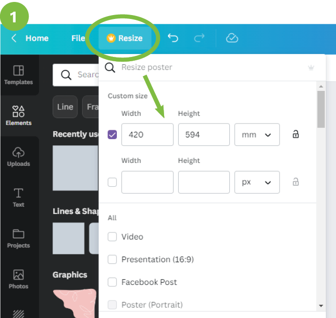 - Start a new design then go to Resize > Custom Size